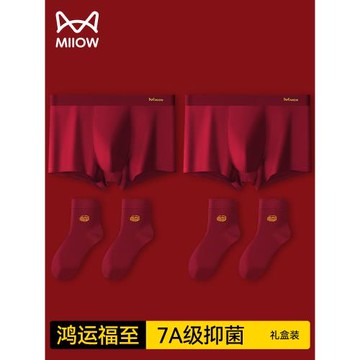 貓人酒紅色男士內褲男本命年純棉平角褲抗菌結婚送禮男生短褲禮物