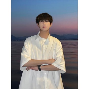港風白色襯衫男短袖潮牌潮流高級感冰絲襯衣休閑痞帥外套夏季寬松