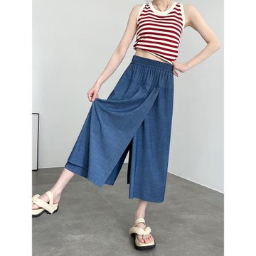 (免運)闊腿裙褲女夏季薄款2024新款高腰垂感a字顯瘦開叉冰絲牛仔半身裙