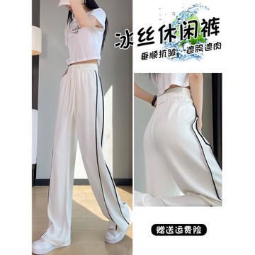 (免運)冰絲闊腿褲女夏季薄款2025新款寬松休閑白色運動褲子高腰直筒衛褲