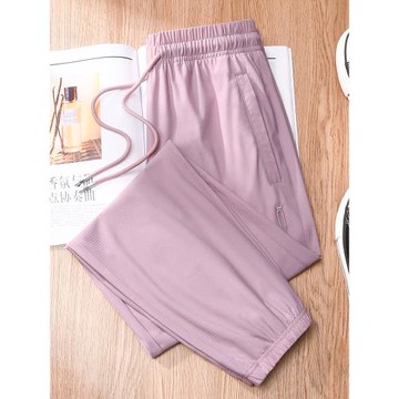 (免運)粉色冰絲運動褲女夏薄款垂感洋氣顯瘦寬松休閑褲九分束腳速干衛褲