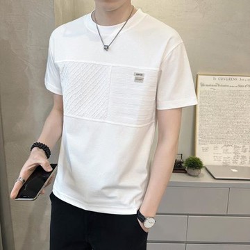 (免運)2025夏季新款拼接條紋圓領短袖男冰絲棉潮牌修身涼感白色T恤男士