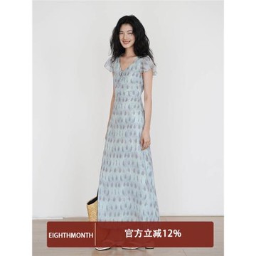 (免運)EIGHTHMONTH 法式復古花案v領連衣裙女夏季2025新款修身顯瘦裙子