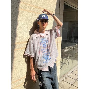 點我下載EAHO美式復古字母噴繪鏤空假兩件短袖夏季男女寬松慵懶潮牌T恤
