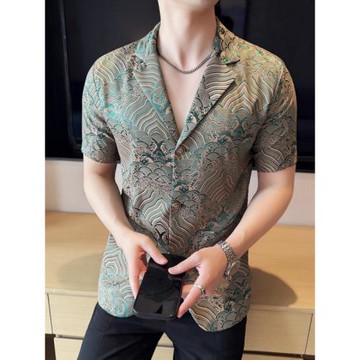 花西裝男短袖夏薄款高級感痞帥修身潮牌冰絲休閑印花襯衫半袖西服