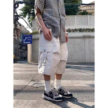 點我下載夏季日系復古中性工裝短褲男女學生寬松褶皺七分褲多口袋休閑褲子