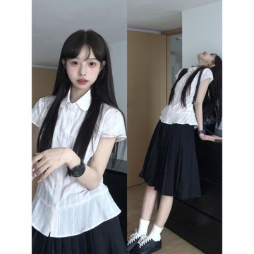 韓系學院風白色甜美條紋翻領收腰小飛袖短袖襯衫女夏季少女感襯衣