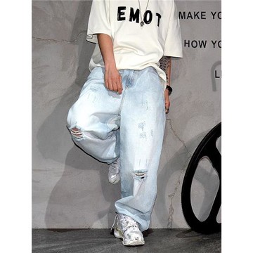 點我下載美式街頭復古痞帥刮爛破洞淺藍色牛仔褲男vibe潮牌寬松闊腿老爹褲