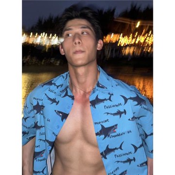 夏威夷創意鯊魚短袖襯衫男夏季東南亞度假穿搭寬松休閑沙灘襯衣