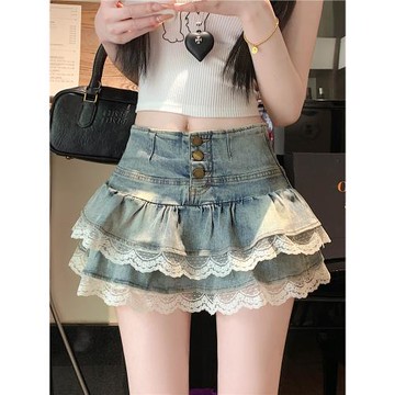 蕾絲花邊蛋糕裙牛仔短裙女夏季高腰顯瘦百褶辣妹蓬蓬裙a字半身裙