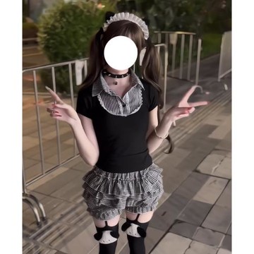 【小周同學】日系可愛辣妹修身黑白格子娃娃領短袖T恤