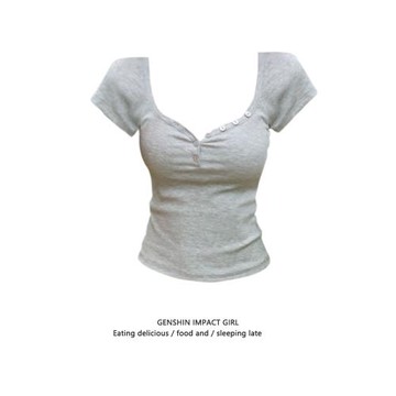 辣妹灰色v領短袖T恤女夏季純欲風修身收腰顯瘦高腰短款顯身材上衣