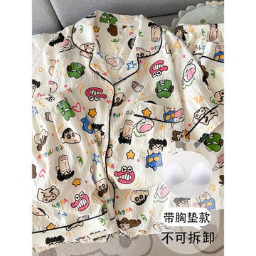 日系動感超人帶胸墊大碼睡衣女夏季短袖云朵純棉紗可愛小新三件套
