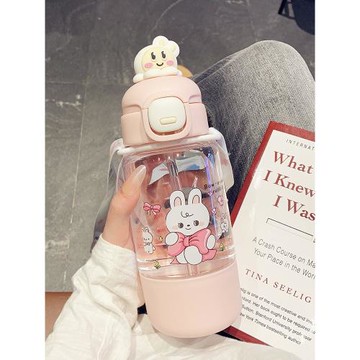 卡通小貓系列雙蓋塑膠杯杯帶繩方便攜帶卡通杯套矽膠吸管飲水杯批