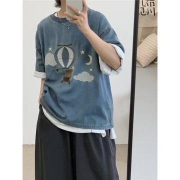 幾布見川牛仔短袖!25夏新款日系復古寬松顯瘦百搭圓領短袖T恤女