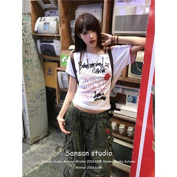 [REコンテナ] 24夏韓版基礎款百搭cat.字母印花修身短款短袖T恤女