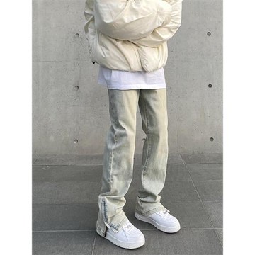 (免運)美式高街vibe復古水洗做舊黃泥染拉鏈開叉牛仔褲男直筒微喇長褲子