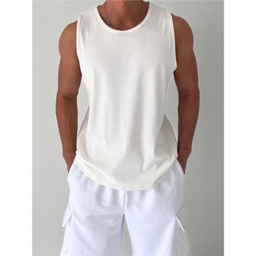 (免運)Primas 白色豎條螺紋寬松背心男夏季休閑彈力美式圓領無袖坎肩