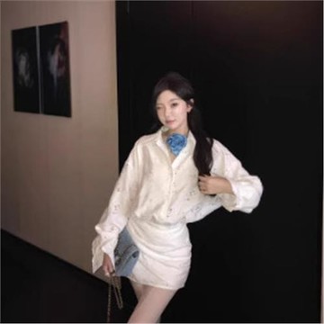 鏤空長袖襯衫連衣裙女春季白色辣妹短裙收腰修身顯瘦裙子