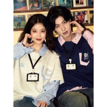 酒釀丸子ALOHA 復古小眾胸牌拼接假兩件套馬甲襯衫情侶裝衛衣秋冬