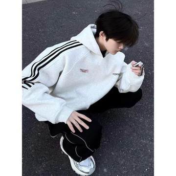 美式復古高街三條杠連帽衛衣男純棉加絨潮牌寬松情侶裝帽衫女