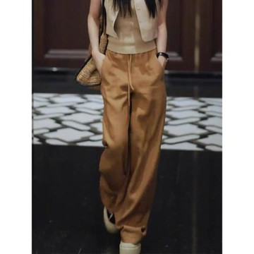 牛X貨 巨炸裂!金棕色亞麻闊腿褲女夏季松弛感高腰寬松直筒休閑褲