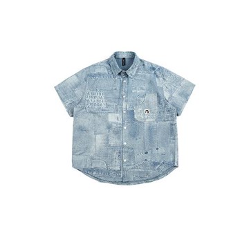 男道復古水洗拼接牛仔短袖襯衫男夏季街頭寬松休閑百搭襯衣外套