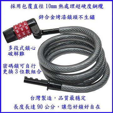 月陽台灣製造自行車超粗10mm專業鋼纜密碼鎖(T-903)