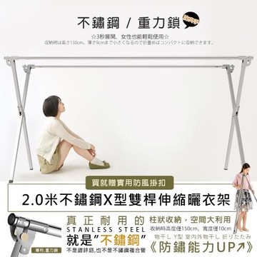 不鏽鋼X型雙桿重力鎖扣伸縮曬衣架2米 (內贈超實用防風掛扣包)
