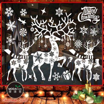 摩達客耶誕-白色4號聖誕雪花麋鹿群-無痕窗貼玻璃貼*2入-優惠組合
