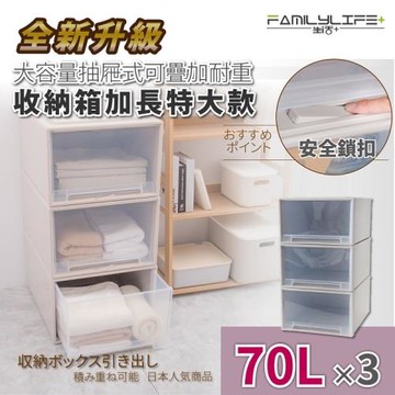 【FL生活+】3入-加長特大款-(70公升)-抽屜安全卡扣可疊耐重收納箱(YG-041*3)