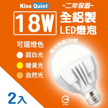 Kiss Quiet 2年保固 18W(護眼白6000K/自然光4000K/3000K黃光) 330度廣角型LED燈泡-2入