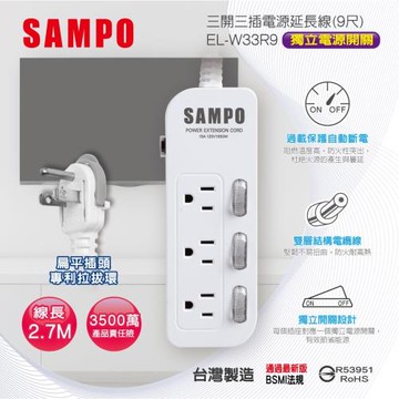 【SAMPO】 三開三插電源延長線(9尺) EL-W33R9