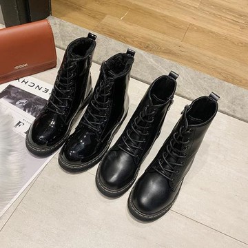 馬丁靴.個性絨面拼接繫帶側拉鍊圓頭平底中筒靴.白鳥麗子