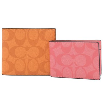 COACH CA001 經典老花撞色皮革附活動夾中短夾.橘紅/粉