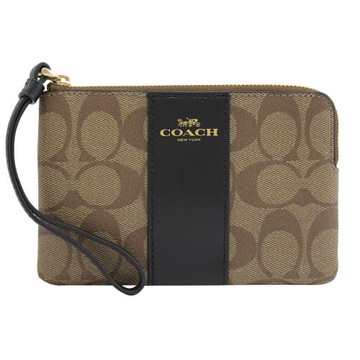 COACH 58035 馬車LOGO條紋皮革零錢手拿包.深咖/黑