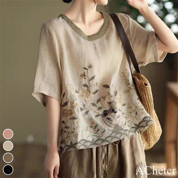 【ACheter】重工刺繡拼色五分袖棉麻寬鬆上衣#113389
