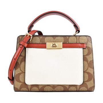 COACH 新款轉扣前口袋拼接PVC皮革雙層手提斜背兩用包(小/卡其x棕白)