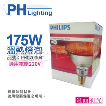 2入 【PHILIPS飛利浦】175W 220V E27 紅外線溫熱燈泡 紅面 PH070004