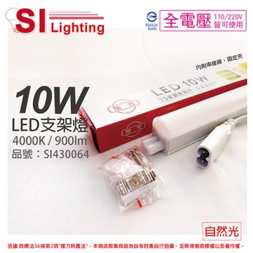 3入 【旭光】 LED 10W 4000K 自然光 2尺 全電壓 兩孔型 支架燈 層板燈 (含串接線) SI430064