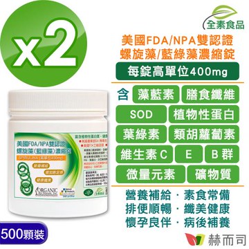 【赫而司】螺旋藻/藍綠藻高單位400mg濃縮錠(500錠*2罐)美國ONS全素食植物性蛋白增加飽足感排便順暢-慈濟共善