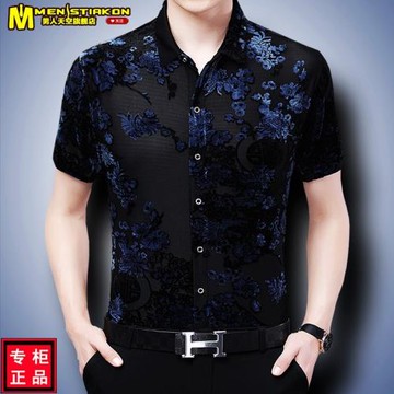 Men's shirts男士襯衫歐美男裝蕾絲玫瑰花朵短袖寬松休閑t恤襯衣