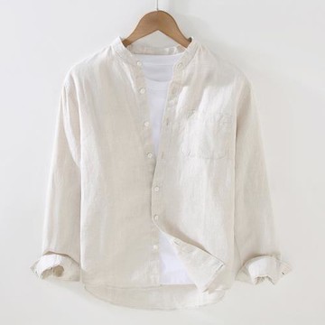 春夏季無領純亞麻襯衫男裝休閑長袖襯衣外套圓領薄款棉麻布上衣服