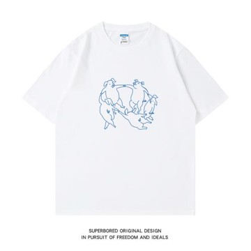 趣味馬蒂斯跳舞的小豬印花短袖T恤男夏季純棉半袖寬松休閑體恤衫