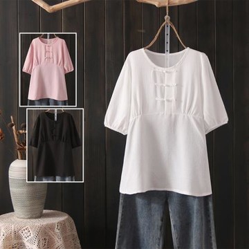 中國風大碼女裝夏季胖mm寬松薄款短袖民族風小衫上衣潮小盤扣T恤