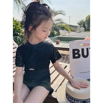 女童黑色蕾絲連體泳衣褲速干可愛夏季兒童小女孩海邊度假溫泉泳裝