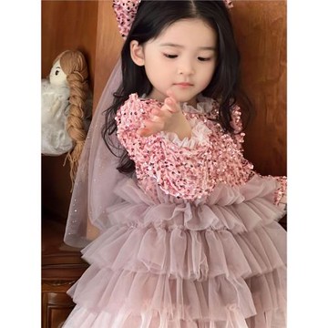 女童春夏連衣裙洋氣蓬蓬裙蛋糕裙兒童周歲生日長袖公主裙小香風仙