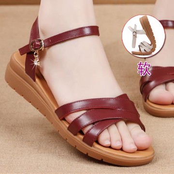 坡跟媽媽涼鞋女夏季真皮軟底中老年閏月鞋厚底女鞋大碼防滑老人鞋