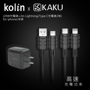 KAKUSIGA PD/QC快充組合3 (20W充電頭+2m Lightning/Type C充電線2條) for iphone/安卓