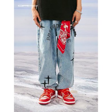 歐美原創美式街頭vibe重工刺繡破洞牛仔褲男女潮牌新款拉絲長褲子
